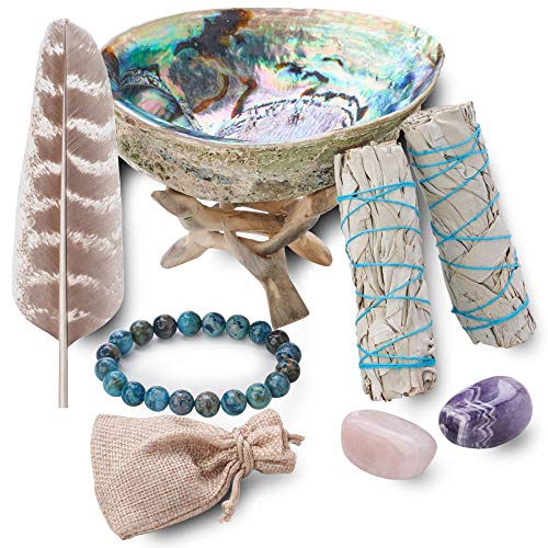 In addition to the Blue Agate bracelet, this kit also includes 2 White Sage Bundles, Rose Quartz, Amethyst, Abalone Shell with Stand, Smudging Feather, Instructions, and Blessings. Each item in this kit is carefully selected to provide you with a holistic smudging experience.